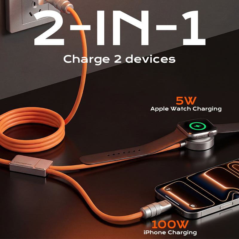 Simplify your setup with our 2-in-1 charging cable, powering both your smartwatch and phone at once while keeping your desk clean and tidy.